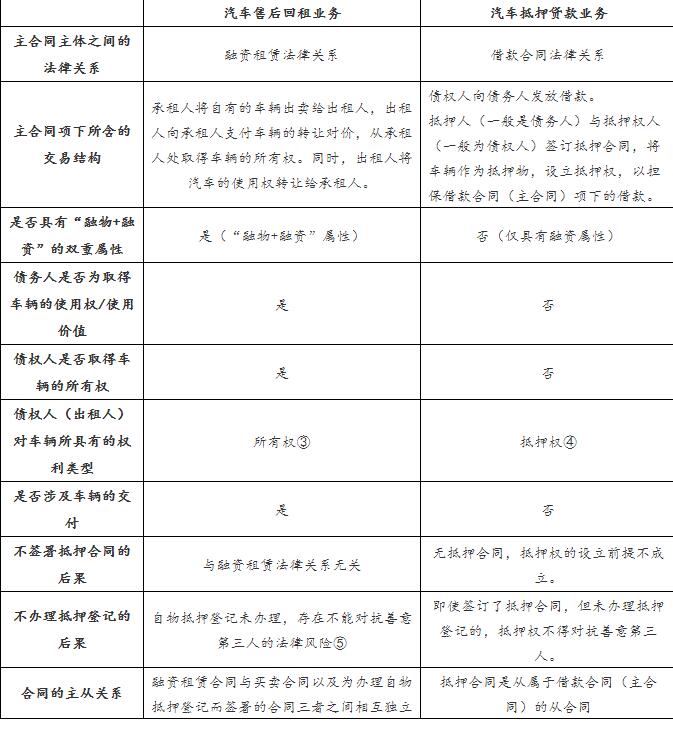 汽车售后回租业务①与汽车抵押担保贷款业务这二者间究竟有何区别,是汽车金融实务领域的一个高频问题。一些汽车金融领域的从业人员甚至认为,前述二者之间并无实质性差别。有的观点甚至认为,由于实务中,汽车融资租赁交易中的出租人往往会对租赁车辆办理抵押登记,这与融资租赁法律关系中作为租赁物的汽车所有权应当归出租人所有是矛盾的,因此出租人与承租人双方之间,不构成融资租赁法律关系;进而认为,汽车售后回租业务实际系出租人向客户(即承租人)出借款项,系违反监管法规的违规经营行为。