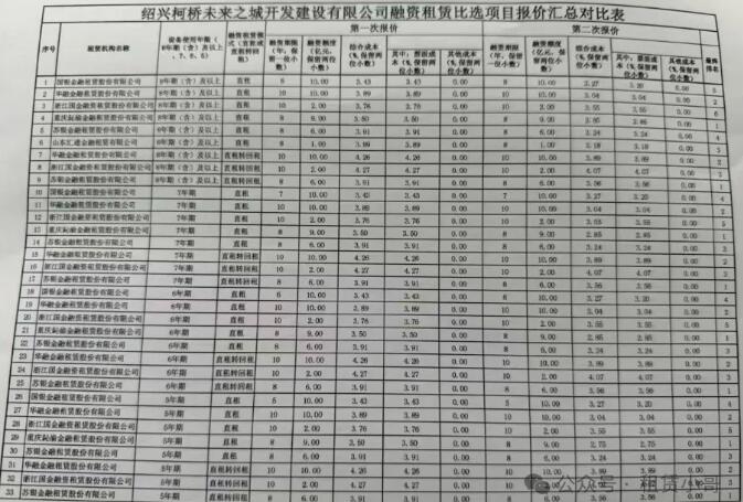 这是近期绍兴柯桥未来之城开发建设有限公司的融资租赁招标报价汇总单。
