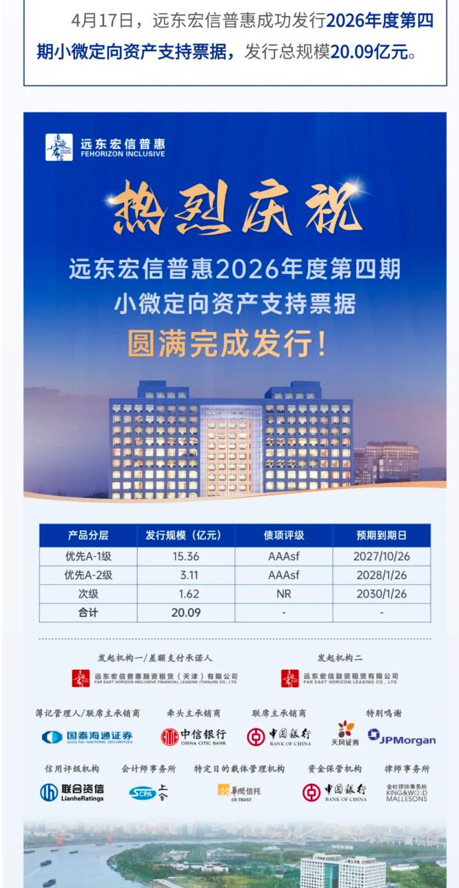 远东宏信普惠融资租赁公司成功发行2026年度第四期小微定向资产支持票据
