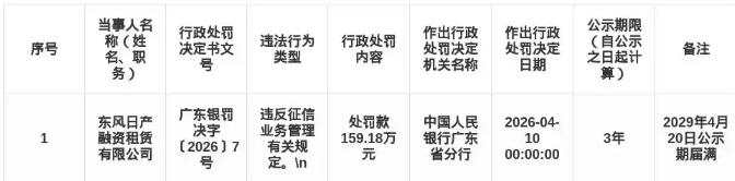 罚单显示,东风日产融资租赁有限公司的主要违法违规事实为:违反征信业务管理有关规定。