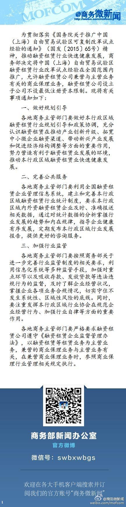 商务部官方微博28日发布消息称,为推动融资租赁行业快速健康发展,商务部决定将上海自贸区融资租赁行业改革试点经验在全国范围内推广。