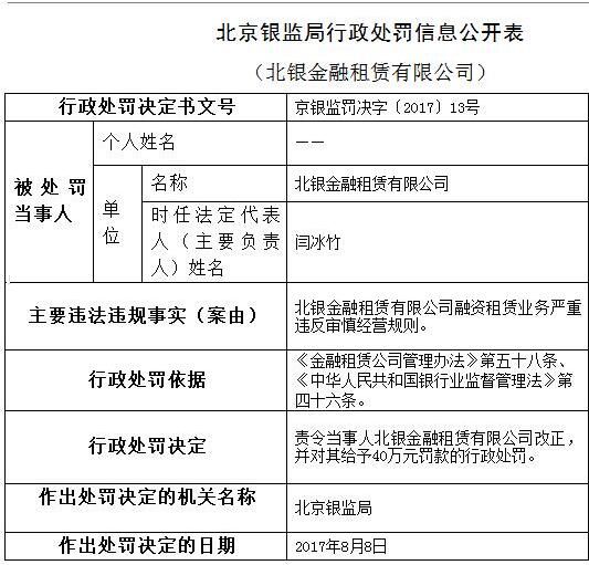 8月18日,北京银监局公布对北银金融租赁有限公司的行政处罚决定书(京银监罚决字〔2017〕13号)。北银金融租赁有限公司的主要负责人是闫冰竹,该行存在融资租赁业务严重违反审慎经营规则的违法违规事实。