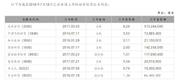 截至2018年7月18日已在香港上市的融资租赁企业名单