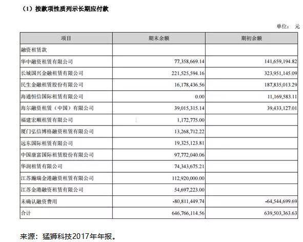 2017年, 12家融资租赁公司为猛狮科技供血,截至2017年末,融资租赁公司的长期应付款合计6.47亿元。其中海通恒信国际租赁有限公司年末款项已结清,成功上岸。