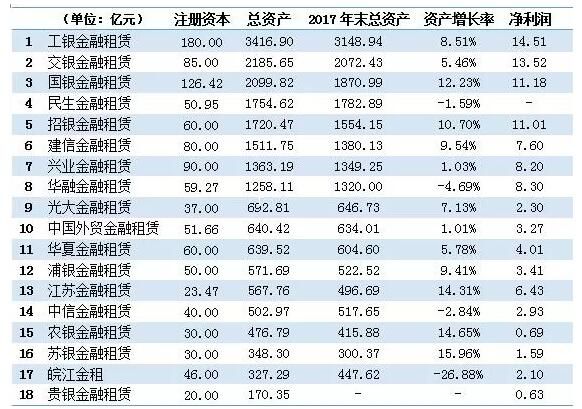 从资产规模来看,工银租赁依旧排在首位,总资产规模达3416.90亿元,较2017年底增幅达8.51%。近日,工银租赁已顺利完成未分配利润70亿元转增资本,注册资本升至180亿元,重回国内金租公司注册资本首位。