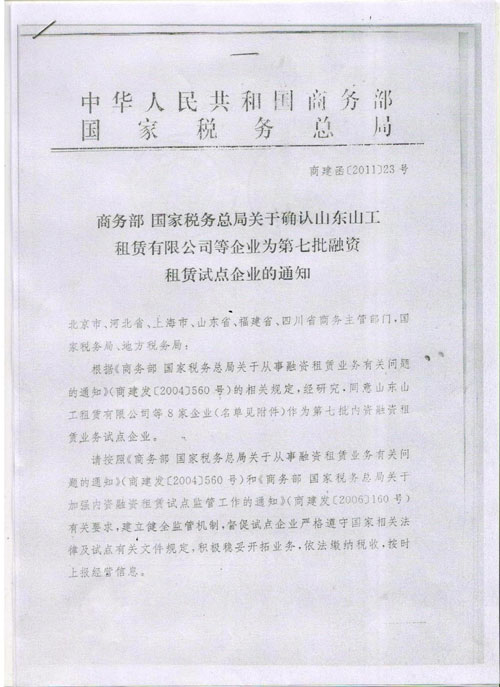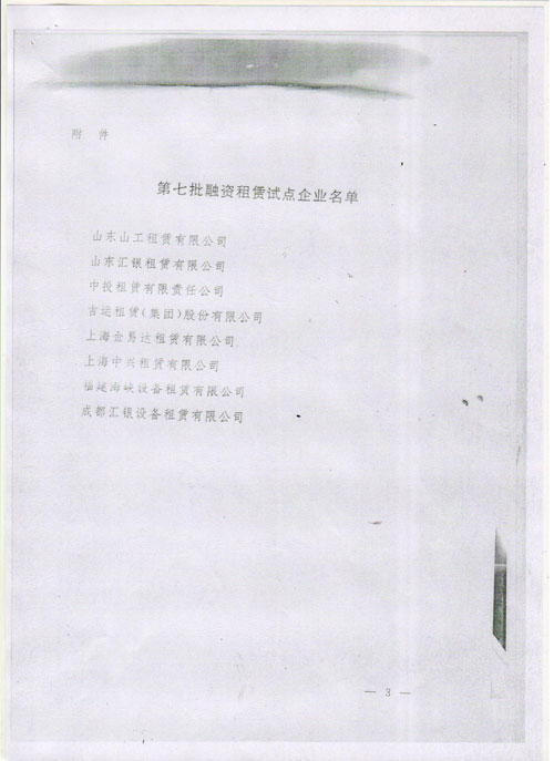 第七批内资试点融资租赁公司2011年1月20日已获商务部和国家税务总局批准成立。本次获得批准的内资试点融资租赁公司共八家,分别是:成都汇银设备租赁有限公司、福建海峡设备租赁有限公司、吉运租赁(集团)股份有限公司、山东山工租赁有限公司、山东汇银租赁有限公司、上海金易达租赁有限公司、上海中兴租赁有限公司、中投租赁有限责任公司。