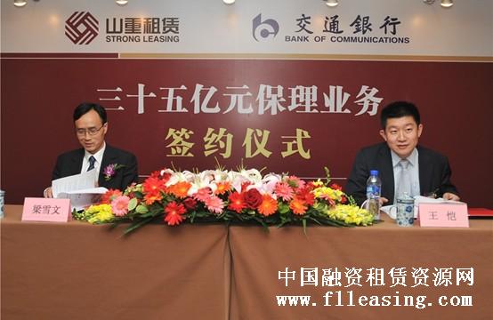 2011年5月6日,山重融资租赁有限公司与交通银行在京签署35亿元保理业务合作协议,用以扩大山重租赁融资租赁业务,支持山东重工集团产品销售。在当前信贷紧缩环境下,扩展资金来源已成为融资租赁公司的核心业务之一。这次签署的保理业务合作协议,不仅授信额度较大,而且属于循环授信,这对山重租赁公司实现长期发展具有重要意义。