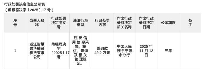近日,中国人民银行宁波市分行发布了行政处罚决定信息公示表,剑指浙江智慧普华融资租赁有限公司。