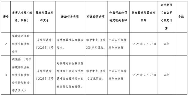 近日,中国人民银行泉州市分行发布了罚单,剑指福建海西金融租赁有限责任公司以及相关责任人。