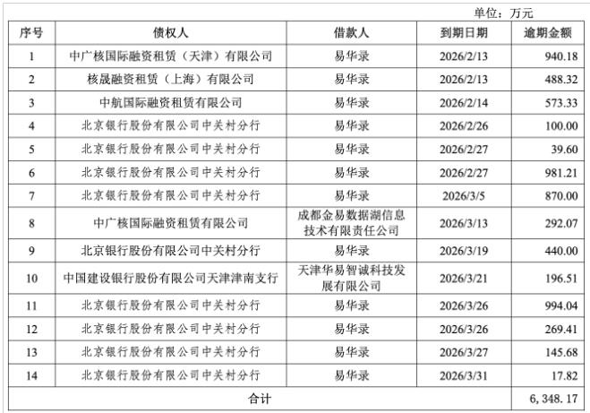 经北京易华录信息技术股份有限公司(以下简称“公司”或“易华录”)相关部门统计核实,截至本公告日,公司累计未能清偿到期债务合计6,348.17万元,占公司2024年度经审计净资产的8.71%,以下为逾期债务具体情况: