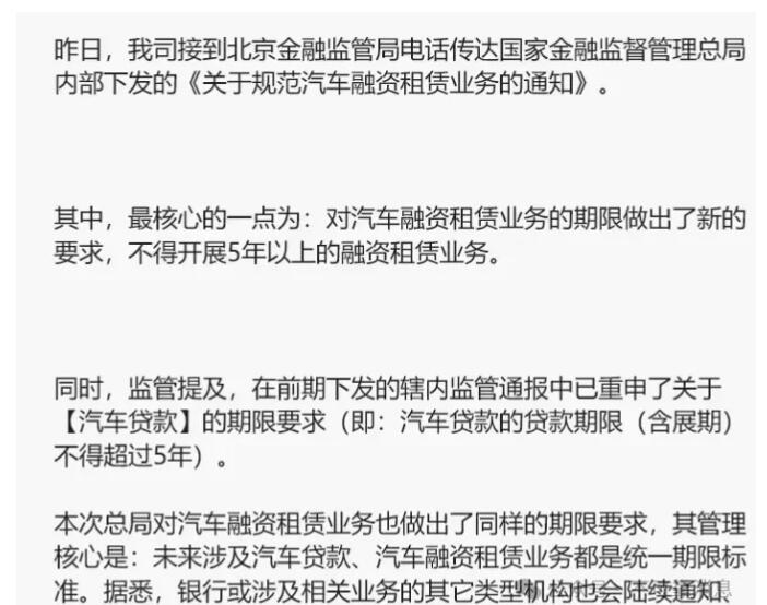 近日,某汽车金融公司收到当地金融监管局传达国家金融监督管理总局内部下发的《关于规范汽车融资租赁业务的通知》,要求汽车金融公司开展的汽车融资租赁(也包括汽车贷款业务)的期限最长不得超过5年。此前,约一个月前,有注册地位于天津的车企融资租赁公司也反映,其7年期汽车融资租赁也被当地监管紧急叫停!