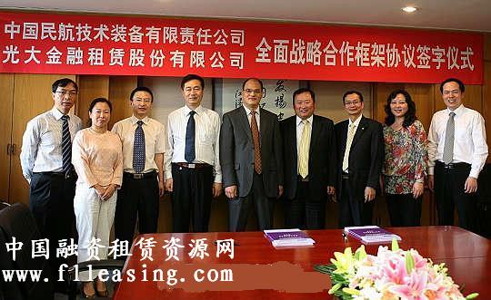 2012年5月14日下午,中国民航技术装备有限责任公司(以下简称:技术装备公司)与光大金融租赁股份有限公司(以下简称:光大租赁公司)在光大租赁公司举行战略合作框架协议签字仪式。技术装备公司总经理任宇、副总经理施毅平、光大租赁公司总裁潘明忠、副总裁戴秋生及双方项目组成员出席仪式。此次战略合作框架协议的签署,标志着双方合作在民航领域开展装备租赁业务达成了共识。