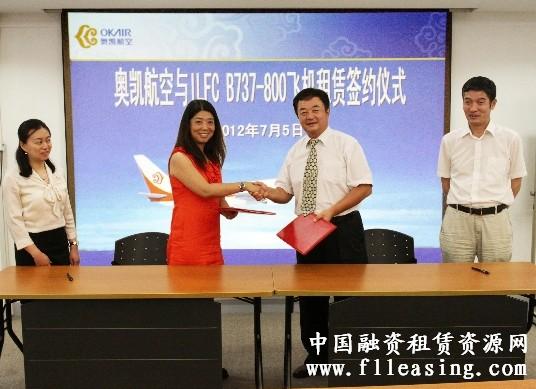 2012年7月5日,奥凯航空有限公司(Okay Airways Company Limited,简称“奥凯航空”)总裁刘伟宁与ILFC副总裁黄立文在北京签署一架波音737-800飞机租赁协议。奥凯航空技术总监李凤斌等高层管理人员出席签约仪式。