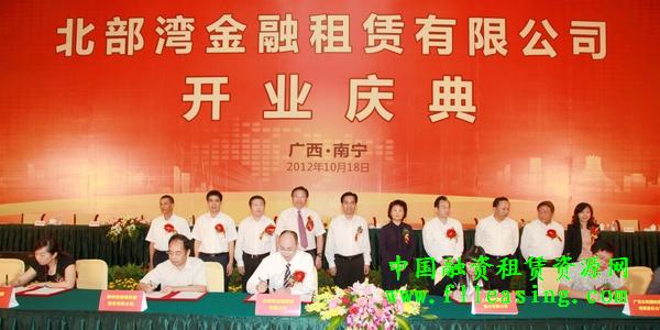 2012年10月18日,北部湾金融租赁有限公司开业庆典在南宁举行。北部湾金融租赁有限公司是广西首家非银行金融机构及区内首家全国性金融租赁公司,它的成立结束了我区没有本土金融总部机构的历史,标志着我区在增加金融资源供给、完善金融市场结构、促进金融产业发展上又迈上一个新台阶。